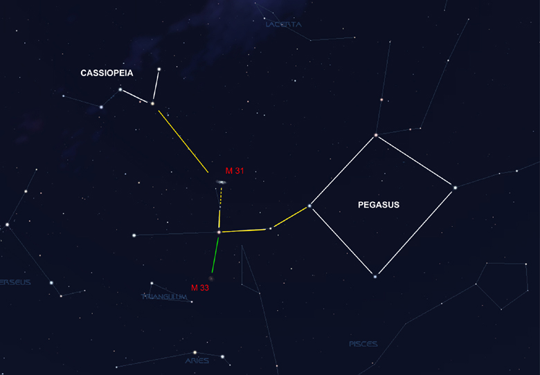 Pegasus. M33 (the Triangulam Galaxy) is a smaller galaxy to the south