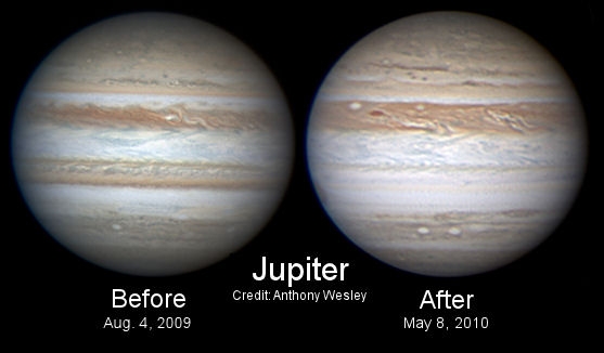 ![]() These side by side images of Jupiter taken by Australian astrophotographer Anthony Wesley show the SEB in August 2009, but not in May 2010.Individual images: Aug. 4, 2009; May 8, 2010 |