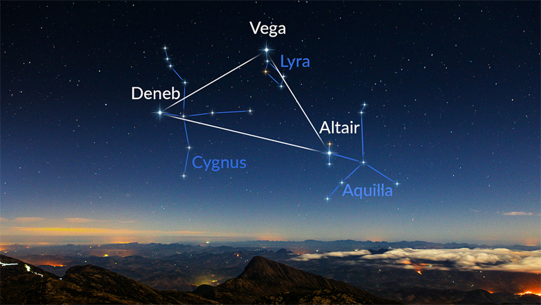 bright stars Vega, in Lyra, and Deneb, in Cygnus, making up the "summer