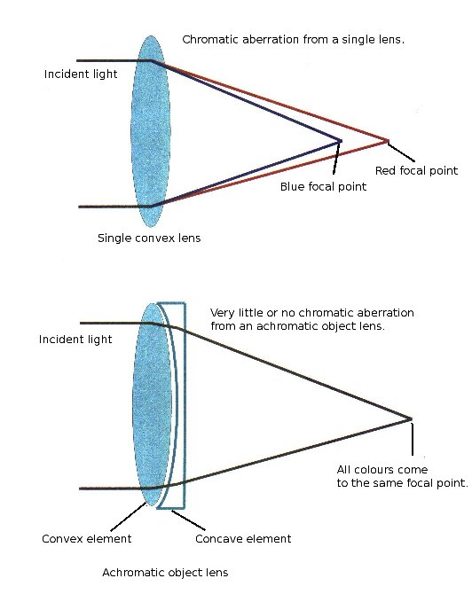 this would be quite impractical. So the two lenses or elements, being of opposite types cancel out each other's undesired effect. This is how modern refractors overcome chromatic aberration or false colours. Some refractor designs use three elements to make up the objective and these are known as "apochromatic lenses" Some