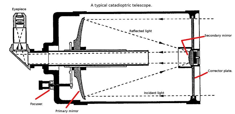 Part Four. The catadioptric or Cassegrain telescope. Lenses and mirrors working in harmony. Well we have covered the refracting telescope, binoculars and the reflecting telescope. Now let's move onto the most complicated telescope of the three. Catadioptric telescopes make use of the best of both the refractor and reflecting telescopes. They use a combination of mirrors and a corrector plate lens to provide a physically short tube, but with a much longer focal length. The two most popular types of telescope to come under this category are the "Schmidt Cassegrain" and the "Maksutov Cassegrain" To understand how this somewhat curious design works, it is easier, for the time being, to think of them as a short Newtonian reflector with a type of lens placed across the front of the tube. Also for now I will refer to both types as CATs. Not to confuse this CAT with the furry variety. The CAT has a tube with a primary mirror at the bottom, just as the reflector and a secondary mirror near the top of the tube. The big difference being the secondary mirror. You will hopefully remember from the reflector that we sometimes refered to the secondary mirror as the flat. However with this design of scope the secondary mirror is not flat at all. It has a convex shape, not unlike a lens, but it is a mirror. The primary mirror has the same type of parabolic shape as the Newtonian but with a much deeper dish. This gives the mirror a much shorter focal length. Light enters and travels down the tube until it encounters the primary mirror. It is then reflected back up the tube where it meets the secondary mirror. The light is then reflected back down the tube again, only this time the rays have been focused into a cone shape and through a hole in the centre of the primary mirror. Here they pass into the focuser and eyepiece at the rear of the scope. The