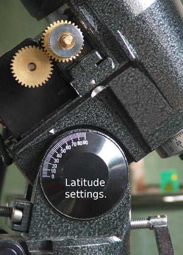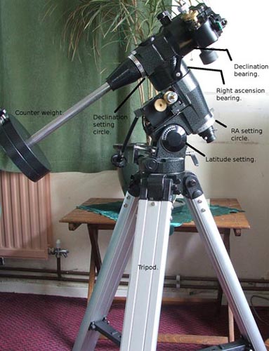 If you have paid attention to the night sky you will have noticed that the stars, Moon, Sun and the other objects move across the sky. For us here in the northern hemisphere they travel from east to west. This movement is due to the rotation of the Earth, we are standing on a rotating platform. If we could draw lines across the sky that show the track objects follow, we would see arcs across the sky. The equatorial mount is designed so that one of its bearings or axes accurately follows these arcs. The axis of the mount that follows this track is called the "right ascension bearing" and must aligned so that it is angled, to the horizontal, by the same amount as the observer's latitude on Earth. The other axis of the mount is known as the "declination bearing". This bearing is at right angles to the right ascension bearing, so the mount looks like the letter "T", but tilted over.