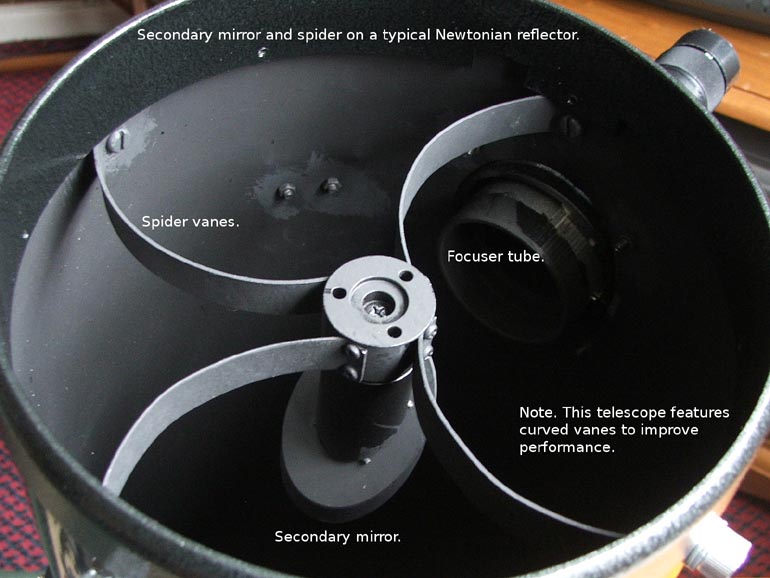 Part Three. The reflecting telescope, the power of the mirror A reflecting telescope makes use of mirrors instead of lenses to gather the light. Just like the refractor, the reflecting telescope has a tube. But this type of telescope has a curved mirror set at the bottom of the tube and a flat mirror set near the top. This flat mirror is angled at about 45 degrees to the curved mirror and is held in place by a "spider". This type of telescope normally has one end of the tube open to the air. The curved mirror is known as the "primary mirror", while the flat mirror is called the "secondary mirror" or "flat". The "spider" consists of three or four metal strips, called vanes, which support the secondary mirror in the centre of the tube. This