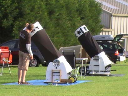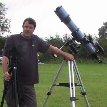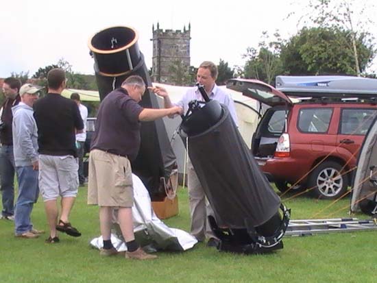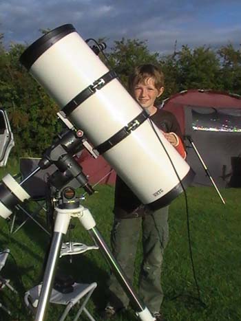 ![]() Owen Brazell standing in front of his large telescope (20" Dobsonian) and the step-ladder lying on the grass nearby needed to reach the viewer! |