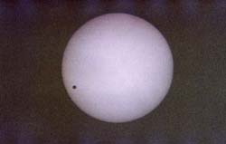Pilot - The Transit of Venus 2004 Sylvia Pilot, a keen member of Swindon Stargazers since its inception, took this fantastic picture of the transit of Venus back in 2004. On the 8th of June, between 5.19 UT (6.19 BST) and 11.23 UT (12.23 BST), Venus passed between the Sun and the Earth. The last time this happened was on 6th December 1882. The duration of such transits is usually measured in hours (the transit of 2004 lasted six hours) |