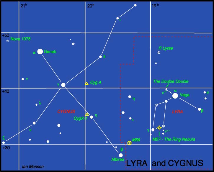 bright stars Vega, in Lyra, and Deneb, in Cygnus, making up the "summer