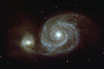 | Though just outside the constellation boundary, M51 lies close to Alkaid, the leftmost star of the Plough. Also called the Whirlpool Galaxy it is being deformed by the passage of the smaller galaxy on the left. This is now gravitationally captured by M51 and the two will eventually merge. M51 lies at a distance of about 37 million light years and was the first galaxy in which spiral arms were seen. It was discovered by Charles Messier in 1773 and the spiral structure was observed by Lord Rosse in 1845 using the 72" reflector at Birr Castle in Ireland - for many years the largest telescope in the world. |
