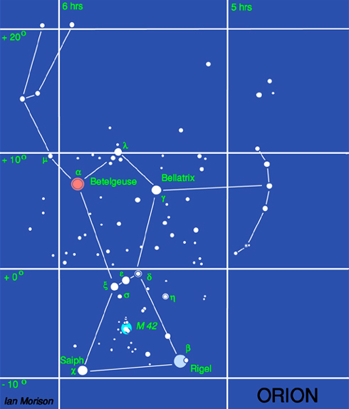 | Orion, perhaps the most beautiful of constellations, will be seen in the south at around 11 - 12 pm during January. Orion is the hunter holding up a club and shield against the charge of Taurus, the Bull up and to his right. Alpha Orionis, or Betelgeuse, is a read supergiant star varying in size between three and four hundred times that of our Sun. The result is that its brightness varies somewhat. Beta Orionis, or Rigel, is a blue supergiant which, at around 1000 light years distance is about twice as far away as Betelgeuse. It has a 7th magnitude companion. The three stars of Orion's belt lie at a distance of around 1500 light years. Just below the lower left hand star lies a strip of nebulosity against which can be seen a pillar of dust in the shape of the chess-board knight. It is thus called the Horsehead Nebula. It shows up very well photographically but is exceedingly difficult to see visually - even with relativly large telescope. |