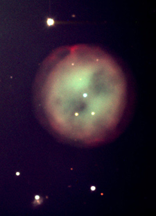 | Between Beta and Gamma Lyra lies a beautiful object called the Ring Nebula. It is the 57th object in the Messier Catalogue and so is also called M57. Such objects are called planetary nebulae as in a telescope they show a disc, rather like a planet. But in fact they are the remnants of stars, similar to our Sun, that have come to the end of their life and have blown off a shell of dust and gas around them. The Ring Nebula looks like a greenish smoke ring in a small telescope, but is not as impressive as it is shown in photographs in which you can also see the faint central "white dwarf" star which is the core of the original star which has collapsed down to about the size of the Earth. Still very hot this shines with a blue-white colour, but is cooling down and will eventually become dark and invisible - a "black dwarf"! Do click on the image below to see the large version - its wonderful! |