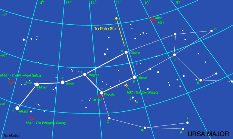 The stars of the Plough, shown linked by the thicker lines in the chart above, form one of the most recognised star patterns in the sky. Also called the Big Dipper, after the soup ladles used by farmer's wives in America to serve soup to the farm workers at lunchtime, it forms part of the Great Bear constellation - not quite so easy to make out! The stars Merak and Dubhe form the pointers which will lead you to the Pole Star, and hence find North. The stars Alcor and Mizar form a naked eye double which repays observation in a small telescope as Mizar is then shown to be an easily resolved double star. A fainter reddish star forms a triangle with Alcor and Mizar. Ursa Major contains many interesting "deep sky" objects. The brightest, listed in Messier's Catalogue, are shown on the chart, but there are many fainter galaxies in the region too. In the upper right of the constellation are a pair of interacting galaxies M81 and M82 shown in the image below. M82 is undergoing a major burst of star formation and hence called a "starburst galaxy". They can be seen together using a low power eyepiece on a small telescope. |